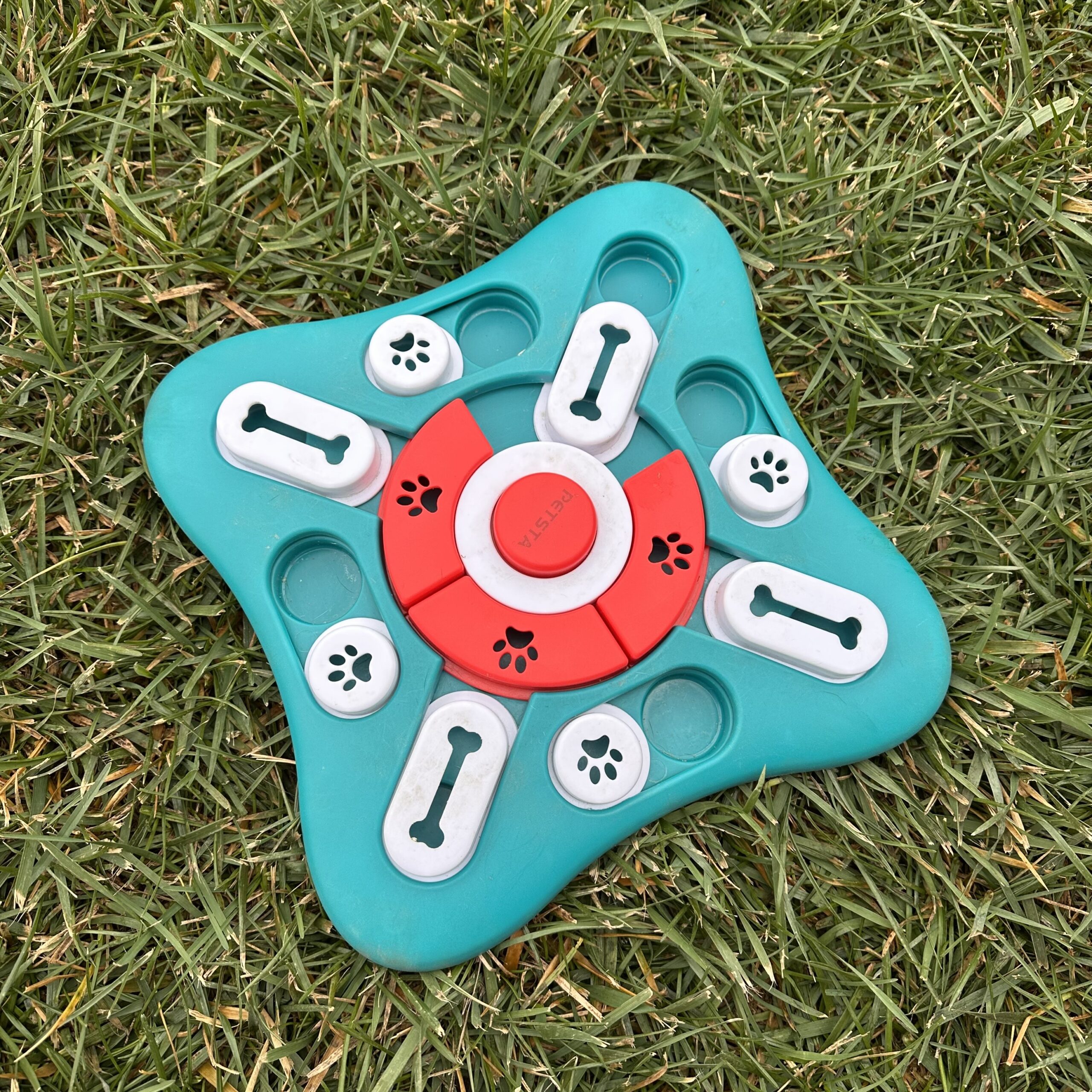 This toy is one of the most engaging for your pup, where there are holes under the moving plastic pieces, and your dog needs to use their snout or paws to move the plastic to get the treat in the hole! This is made out of a durable plastic because Gigi scratches at it, and it still hasn’t broken or even have a dent in it!